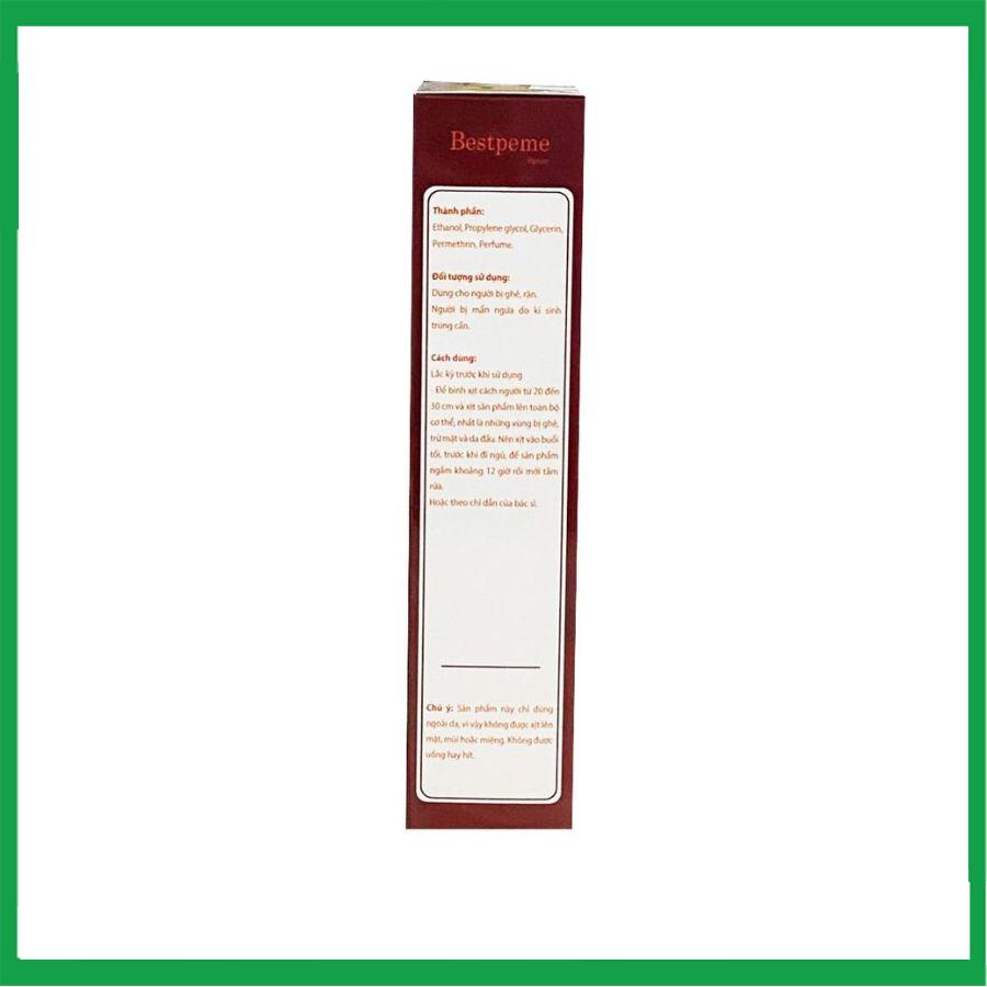 - Chai xịt Bestpeme Spray là sản phẩm hỗ trợ điều trị ký sinh trùng, trị ghẻ được điều chế dưới dạng xịt. Sản phẩm thường được sử dụng để điều trị tại chỗ cho các loại bệnh ghẻ như ghẻ nước, ghẻ xốn, chấy, rận và các loại ký sinh trùng khác, khắc phục tổn thương trên da do bệnh gây ra.