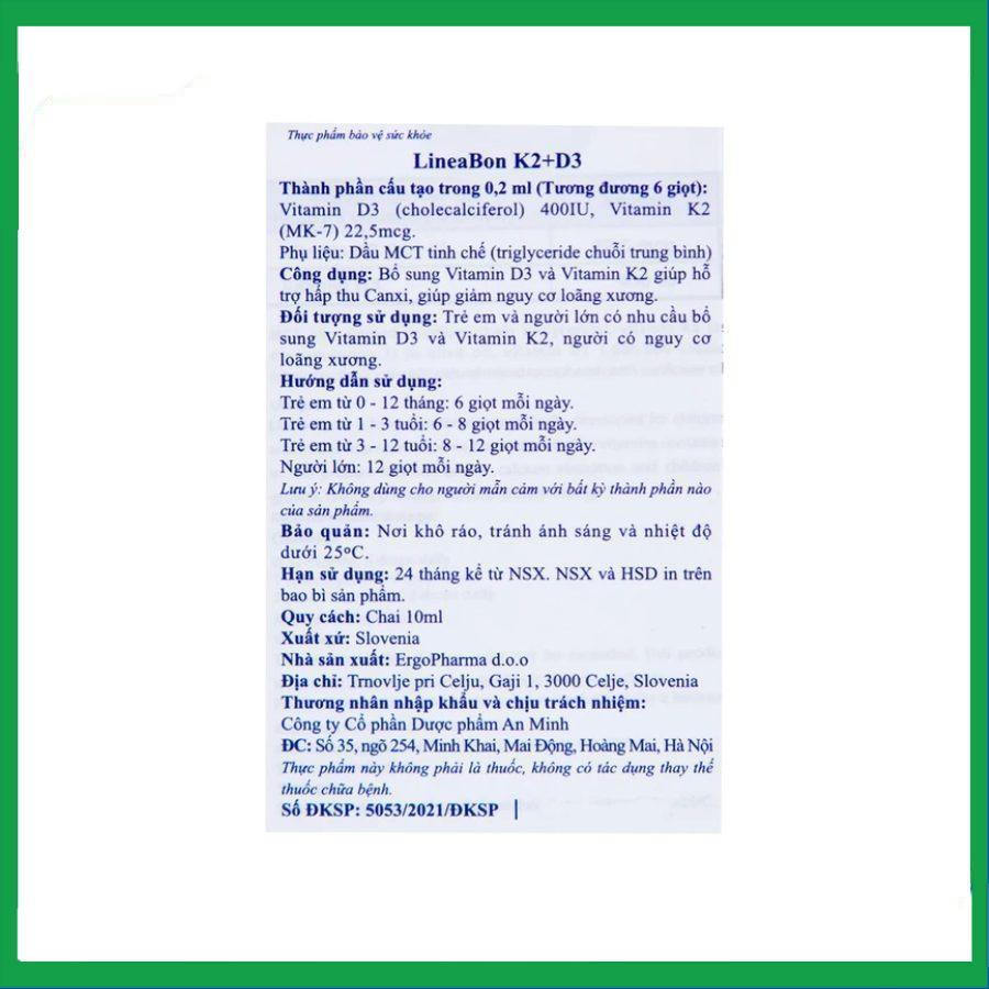 Dung dịch nhỏ giọt hỗ trợ tăng chiều cao cho bé LineaBon K2+D3 bổ sung Vitamin D3 và vitamin K2, giúp hấp thu canxi hiệu quả, cải thiện mật độ xương, giúp cho hệ xương và răng chắc khỏe.