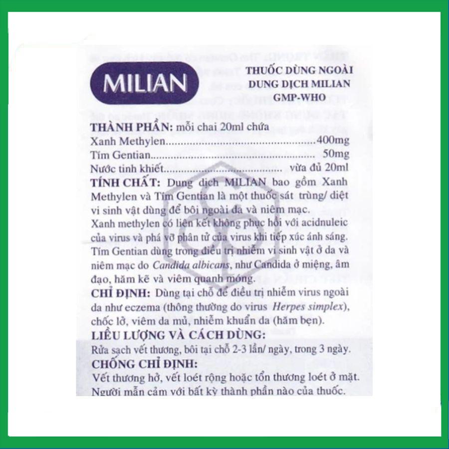 Dung dịch Milian bao gồm Xanh Methylen và Tím Genian là một thuốc sát trùng diệt vi sinh vật dùng để bôi ngoài da và niêm mạc.