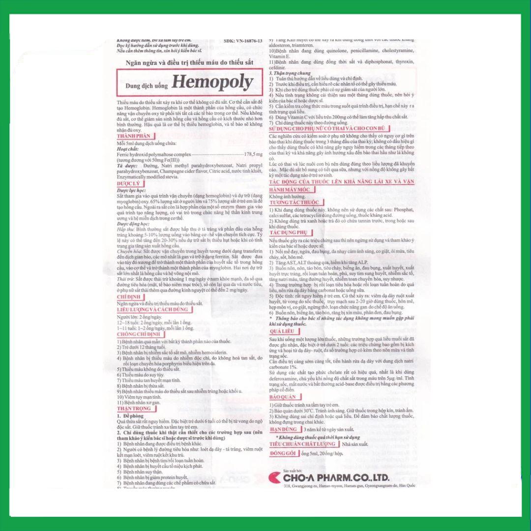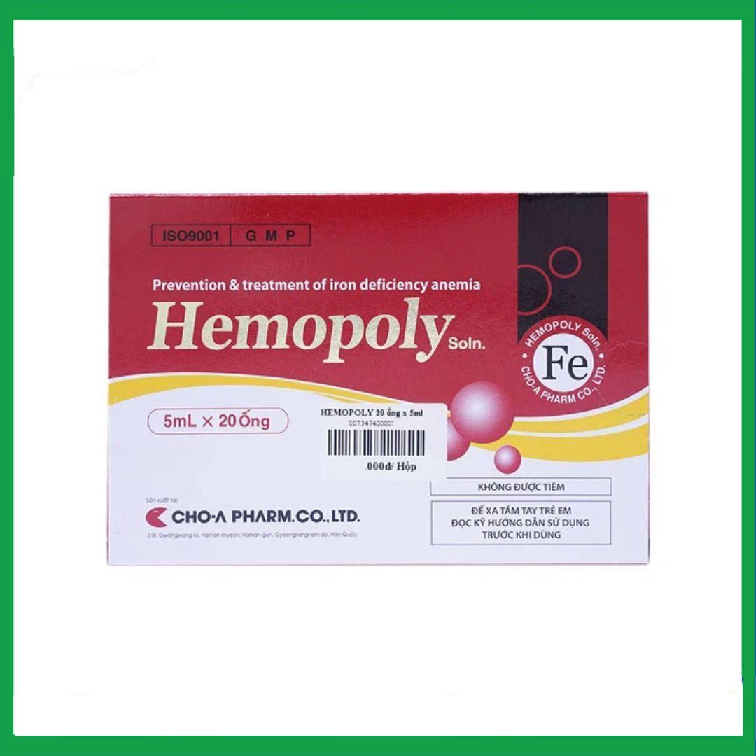 Dung dịch uống Hemopoly của nhà sản xuất CHO-A Pharm, Hàn Quốc. Thành phần chính Ferric hydroxid polymaltose complex, đây là thuốc dùng ngăn ngừa và điều trị thiếu máu do thiếu sắt.