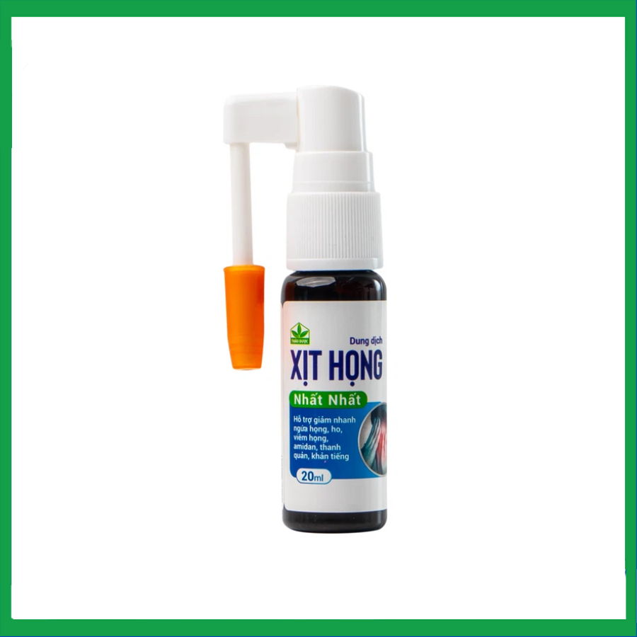 Xịt họng Nhất Nhất là sản phẩm của Công ty TNHH Dược phẩm Nhất Nhất có thành phần chính là chiết xuất từ các dược liệu tự nhiên như xạ can, kim ngân hoa, bạch chỉ, lá trầu không, hoàng bá, ngũ vị tử, hoa đu đủ đực, lá đào, natri benzoate, tinh dầu bạc hà. Xịt họng Nhất Nhất có công dụng hỗ trợ làm giảm nhanh ngứa họng, ho, viêm họng, amidan, thanh quản, khản tiếng.