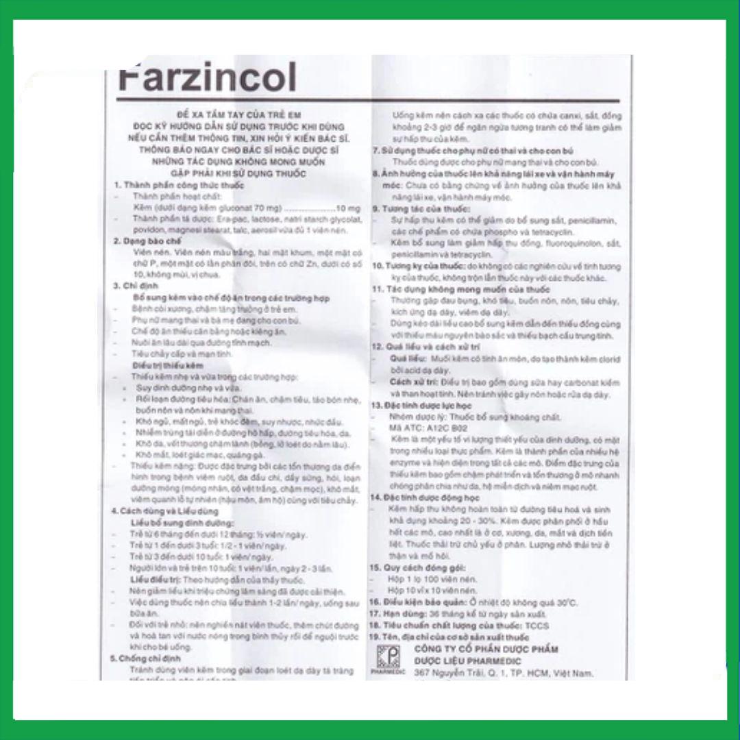 Farzincol của công ty cổ phần dược phẩm dược liệu Pharmedic, thành phần chính kẽm gluconat 70 mg (tương đương 10 mg kẽm), là thuốc dùng để điều trị bổ sung kẽm vào chế độ ăn trong các trường hợp: Bệnh còi xương, chậm tăng trưởng ở trẻ em. Phụ nữ mang thai và bà mẹ đang cho con bú. Chế độ ăn thiếu cân bằng hoặc kiêng ăn. Nuôi ăn lâu dài qua đường tĩnh mạch. Tiêu chảy cấp và mãn tính. Điều trị thiếu kẽm: Thiếu kẽm nhẹ và vừa trong các trường hợp: Suy dinh dưỡng nhẹ và vừa. Rối loạn đường tiêu hóa: Chán ăn, chậm tiêu, táo bón nhẹ, buồn nôn và nôn khi mang thai. Khó ngủ, mất ngủ, trẻ khóc đêm, suy nhược, nhức đầu...