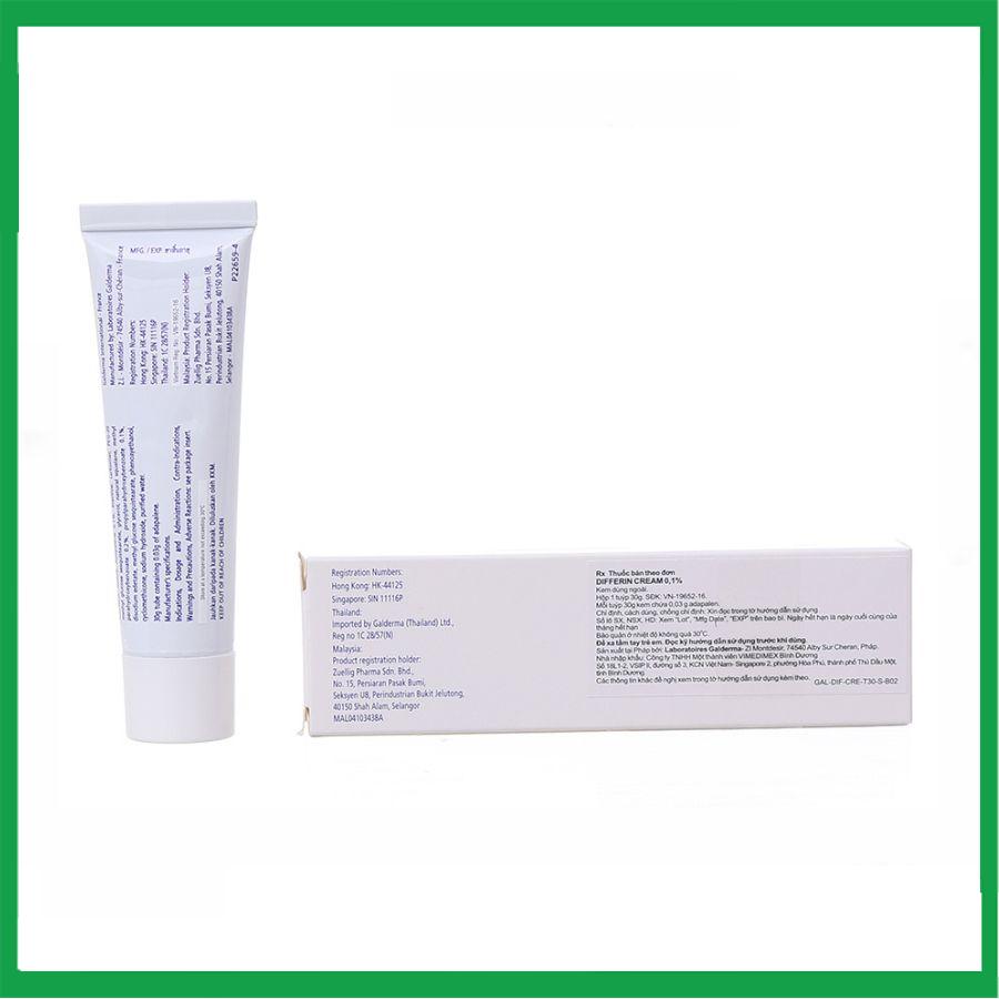 Kem trị mụn Differin 0.1% từ thương hiệu Galderma, được sản xuất bởi Laboratoires Galderma- Pháp. Differin 0.1% thuộc nhóm thuốc điều trị bệnh da liễu, được sử dụng điều trị mụn trứng cá bao gồm mụn nhân, mụn li ti, mụn mủ ở các vị trí mặt, ngực, lưng.