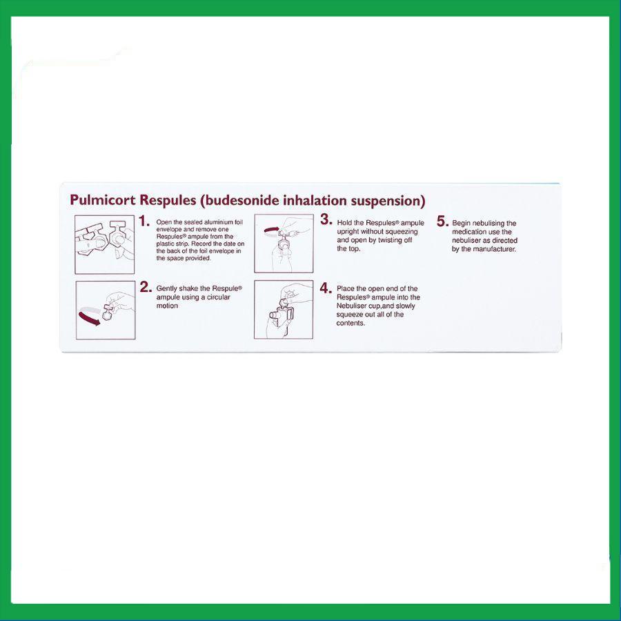 - Trước khi dùng phần chất lỏng còn lại, xoay (lắc) nhẹ ống thuốc để các thành phần trong ống thuốc được phân bổ đều trở lại. Sự lắng đọng có thể xảy ra khi bảo quản Pulmicort Respules. Nếu sau khi lắc mà thuốc không trở lại dạng hỗn dịch thì nên loại bỏ ống thuốc.