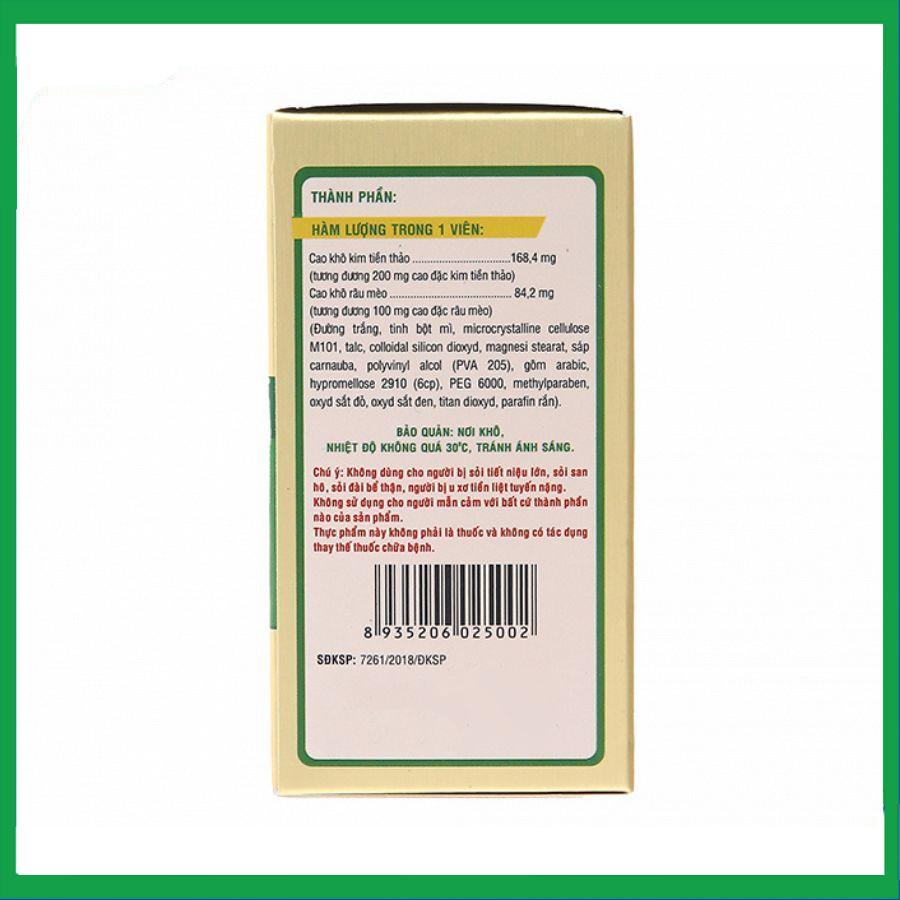 Hàm lượng trong 1 viên:- Cao khô kim tiền thảo 168,4 mg (tương đương 200 mg cao đặc kim tiền thảo), Cao khô râu mèo 84,2 mg (tương đương 100 mg cao đặc râu mèo)