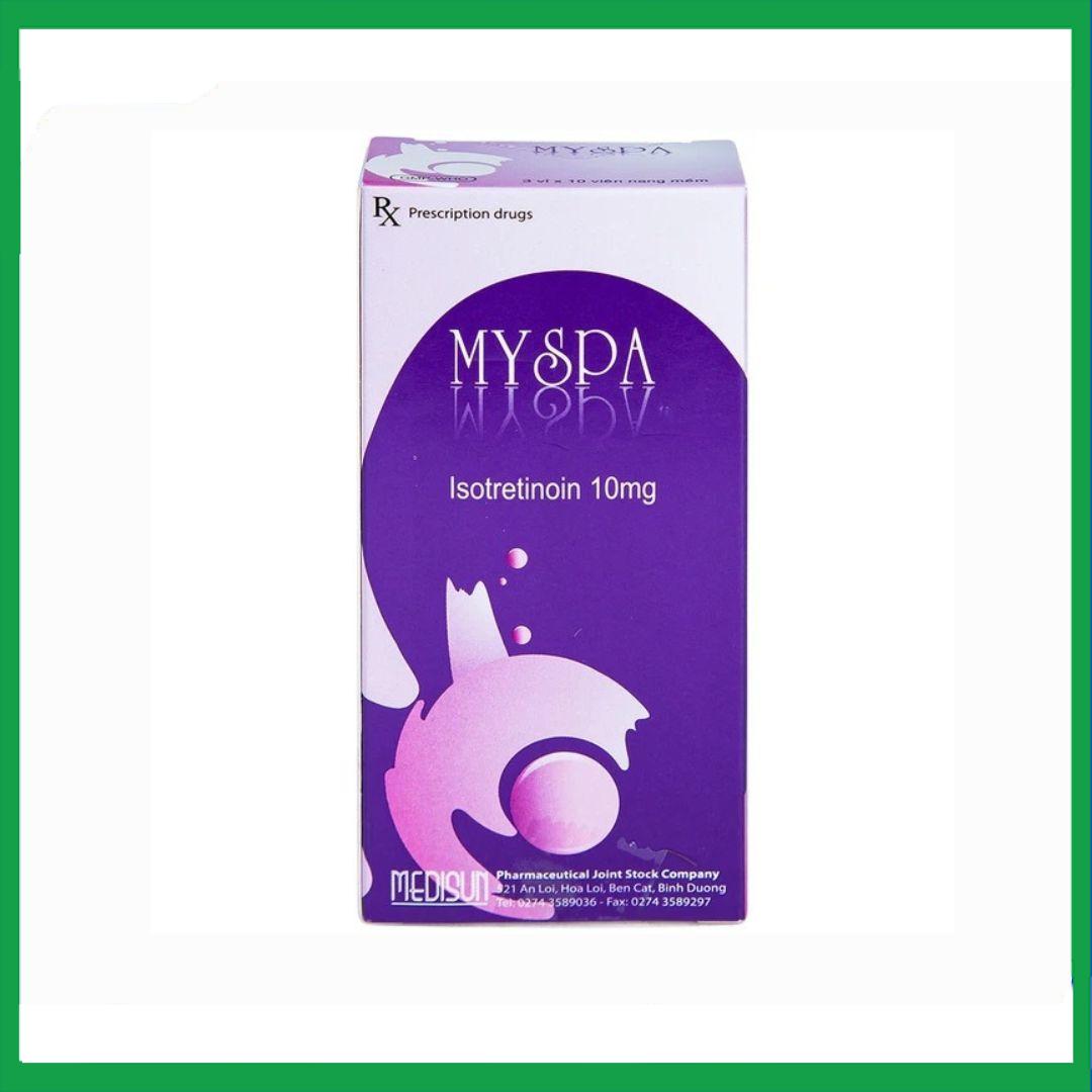 MySpa 10mg là sản phẩm thuốc của công ty cổ phần dược phẩm Me Di Sun với thành phần hoạt chất là isotretinoin được chỉ định trong điều trị các dạng mụn trứng cá nặng, mụn trứng cá không đáp ứng với điều trị trước đó, đặc biệt là mụn trứng cá dạng nang bọc.