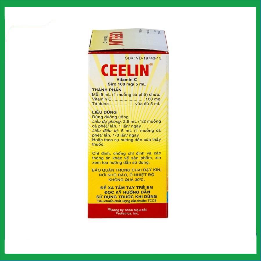 Ceelin 60ml của Công ty TNHH United International Pharma, thành phần chính Vitamin C (dưới dạng Sodium Ascorbate) 100mg/5ml trong chai 60 ml. Đây là thuốc dùng trong phòng ngừa và điều trị thiếu vitamin C ở trẻ sơ sinh và trẻ em, hỗ trợ đề kháng với nhiễm khuẩn và chức năng miễn dịch.
