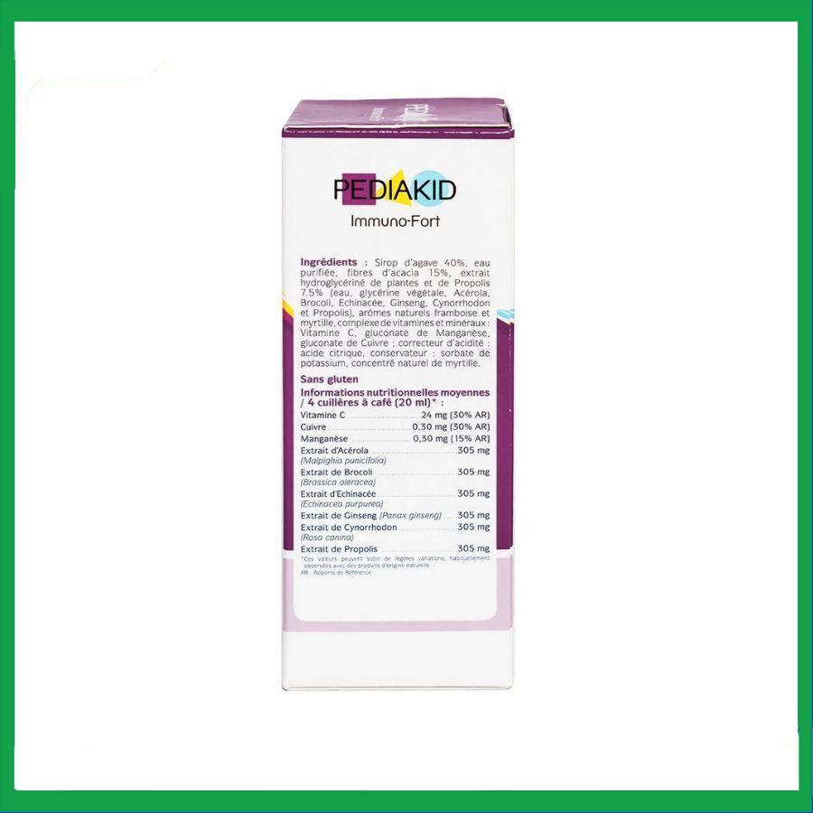 - Pediakid Immuno - Fort chính là sự kết hợp tuyệt vời của các ‘kháng sinh tự nhiên’ được chiết xuất từ echinacea, bông cải xanh, keo ong, sơ ri, nhân sâm, quản tầm xuân. Đây đều là các dưỡng chất vàng có tác dụng thanh nhiệt, giải độc tố và giúp tăng cường hệ miễn cơ thể, chống lại các bệnh nhiễm trùng, nhiễm virus, đồng thời làm tăng số lượng bạch cầu và tiểu cầu. Sự kết hợp của các thành phần này là lý do do siro Pediakid Immuno được đánh giá cao với khả năng củng cố hệ miễn dịch cho trẻ.