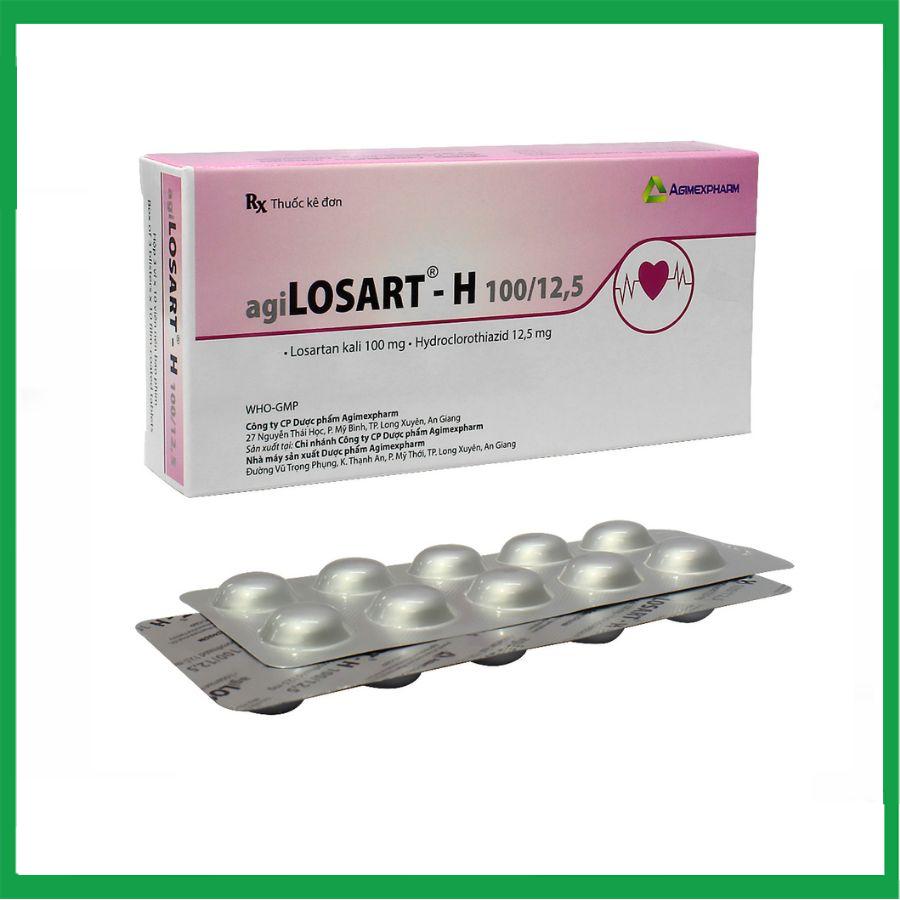 - Agilosart - H 100/12,5 có thành phần gồm hai hoạt chất losartan và hydroclorothiazid được sử dụng cùng với nhau ở dạng phối hợp liều uống một lần mỗi ngày để kiểm soát cao huyết áp. Tác dụng này được cho là kết quả của các tác dụng hỗ trợ lẫn nhau của cả hai thành phần giúp thuốc có tác dụng hiệp đồng trong hạ huyết áp, làm giảm huyết áp tốt hơn khi sử dụng từng thành phần riêng rẽ.