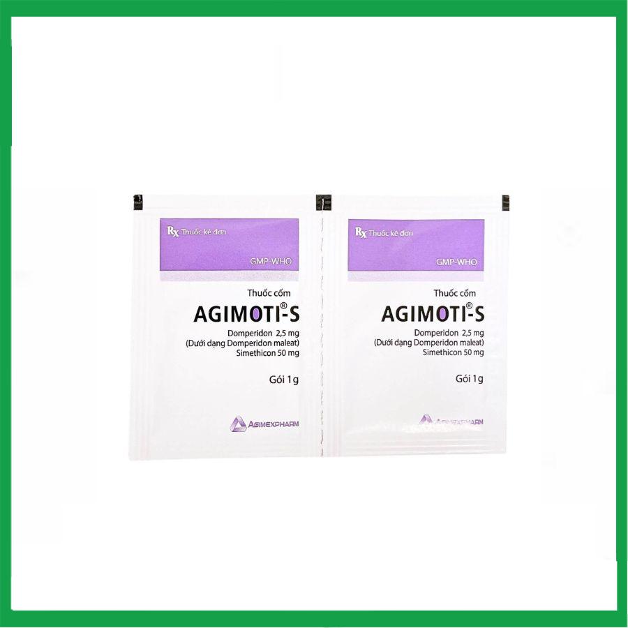 Agimoti-S là sản phẩm của Công ty Cổ phần Dược phẩm Agimexpharm với thành phần chính là Domperidon maleat tương đương Dmperidon 2,5mg; Simethicon 50mg. Thuốc Agimoti-S có công dụng điều trị chứng buồn nôn, nôn, cảm giác chướng và nặng vùng thượng vị, khó tiêu sau bữa ăn do thức ăn chậm xuống ruột.