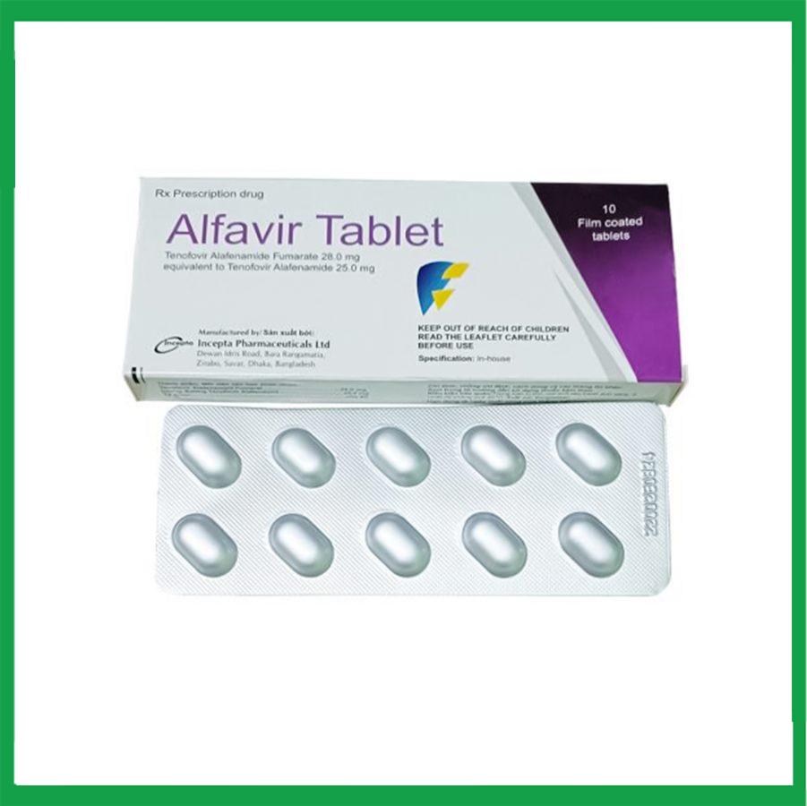 Thuốc Alfavir Tablet của INCEPTA, có thành phần chính là Tenofovir alafenamide. Đây là thuốc dùng để điều trị viêm gan B mạn tính ở người lớn và trẻ từ 12 tuổi trở lên có cân nặng tối thiểu là 35 kg.