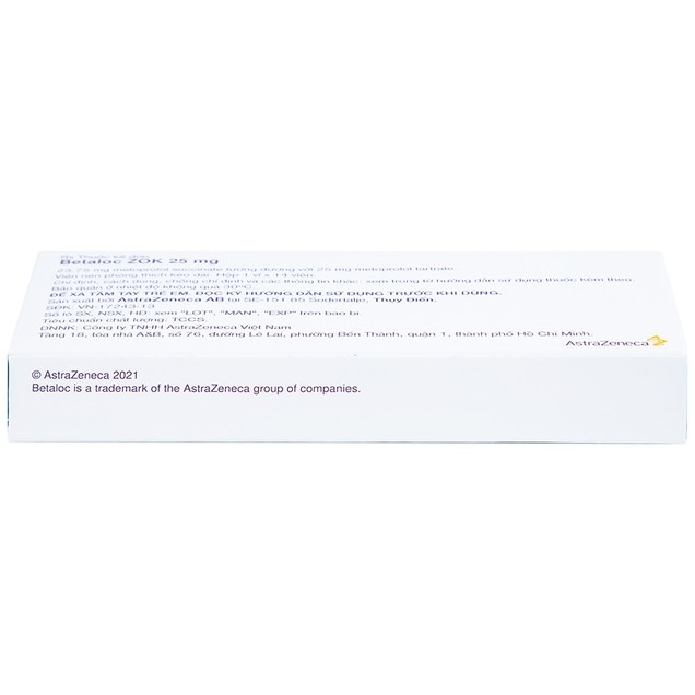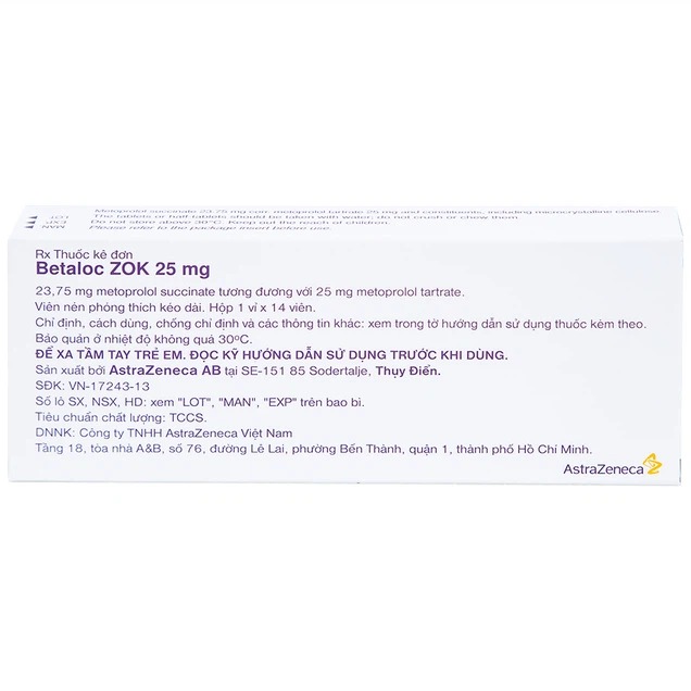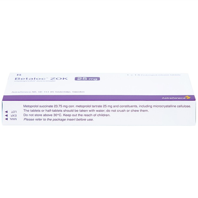 Betaloc ZOK 25 là sản phẩm của Công ty AstraZeneca (Thuỵ Điển), thành phần chính là metoprolol succinate. Thuốc dùng để điều trị tăng huyết áp, suy tim mạn tính ổn định, một số rối loạn nhịp tim nhanh, cơn đau thắt ngực. Ngoài ra, Betaloc ZOK 25 còn được sử dụng dự phòng sau nhồi máu cơ tim. Viên nén phóng thích kéo dài Betaloc ZOK 25mg có màu trắng đến trắng ngà, hình bầu dục, có rãnh hai mặt và khắc chữ A/β trên một mặt. Có thể chia viên nén thành các liều bằng nhau. Thuốc được đóng gói theo quy cách: hộp 1 vỉ x 14 viên nén.