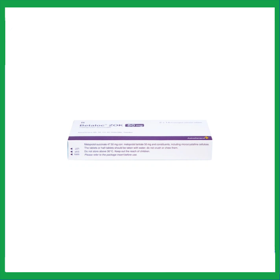 Betaloc Zok 50mg là sản phẩm của Công ty AstraZeneca (Thuỵ Điển), thành phần chính là Metoprolol Succinate. Thuốc dùng để điều trị tăng huyết áp, suy tim mạn tính ổn định, một số rối loạn nhịp tim nhanh, cơn đau thắt ngực. Ngoài ra, Betaloc Zok 50mg còn được sử dụng trong dự phòng sau nhồi máu cơ tim.