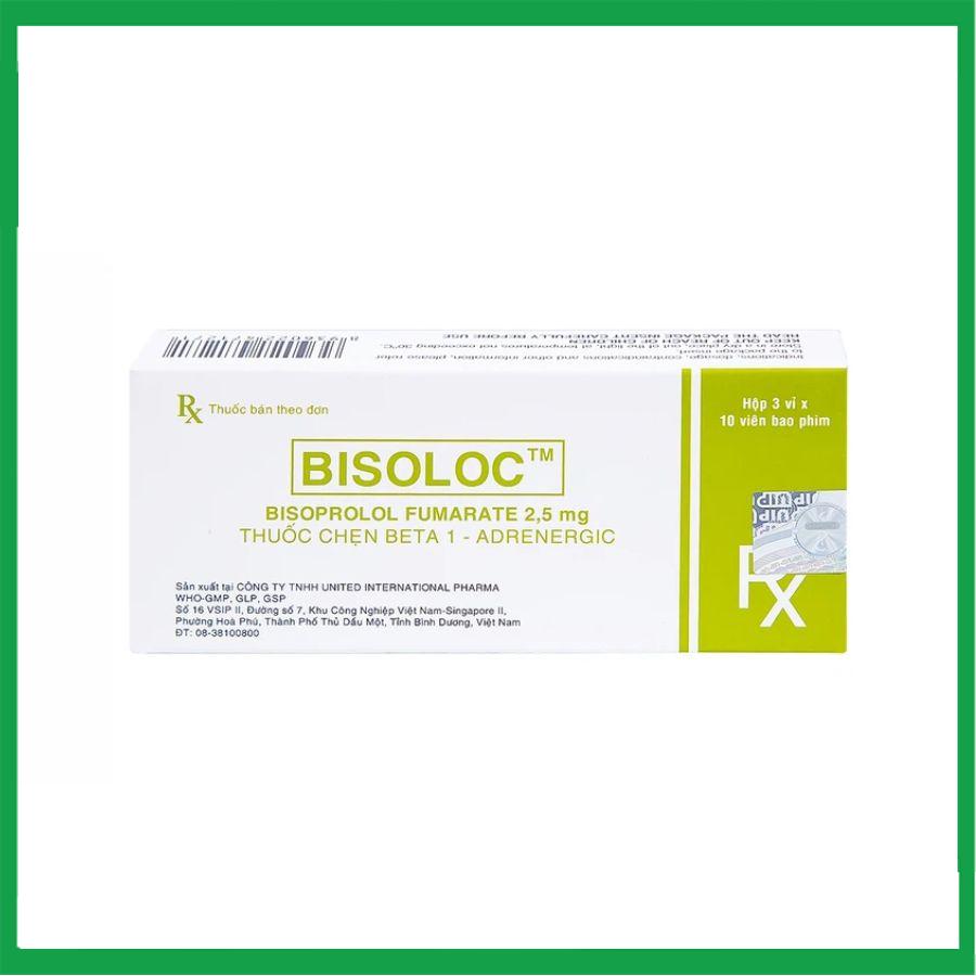 Bisoloc 2,5 mg của nhà sản xuất United (Việt Nam), thành phần chính Bisoprolol fumarate, là thuốc dùng để điều trị điều trị tăng huyết áp và bệnh mạch vành (cơn đau thắt ngực), suy tim mạn ổn định vừa – nặng ở bệnh nhân giảm chức năng tâm thu thất (phân suất tống máu ≤ 35%, dựa trên siêu âm tim) kết hợp ACEI và lợi tiểu, và Glycoside trợ tim nếu cần.