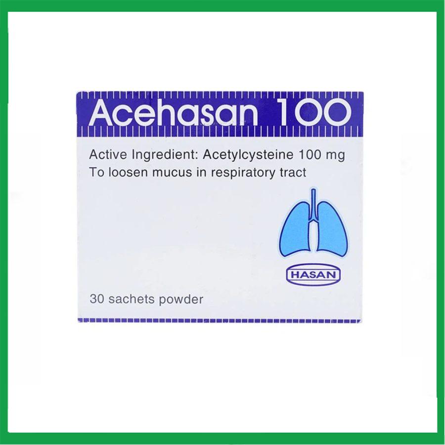 Acehasan 100 của Công ty TNHH Ha San (Dermapharm) sản xuất. Thuốc có thành phần chính là Acetylcystein 200mg. Đây là loại thuốc làm loãng đờm trong các bệnh phế quản – phổi cấp và mãn tính kèm theo sự tăng tiết chất nhầy. Dùng làm thuốc giải độc trong quá liều paracetamol.