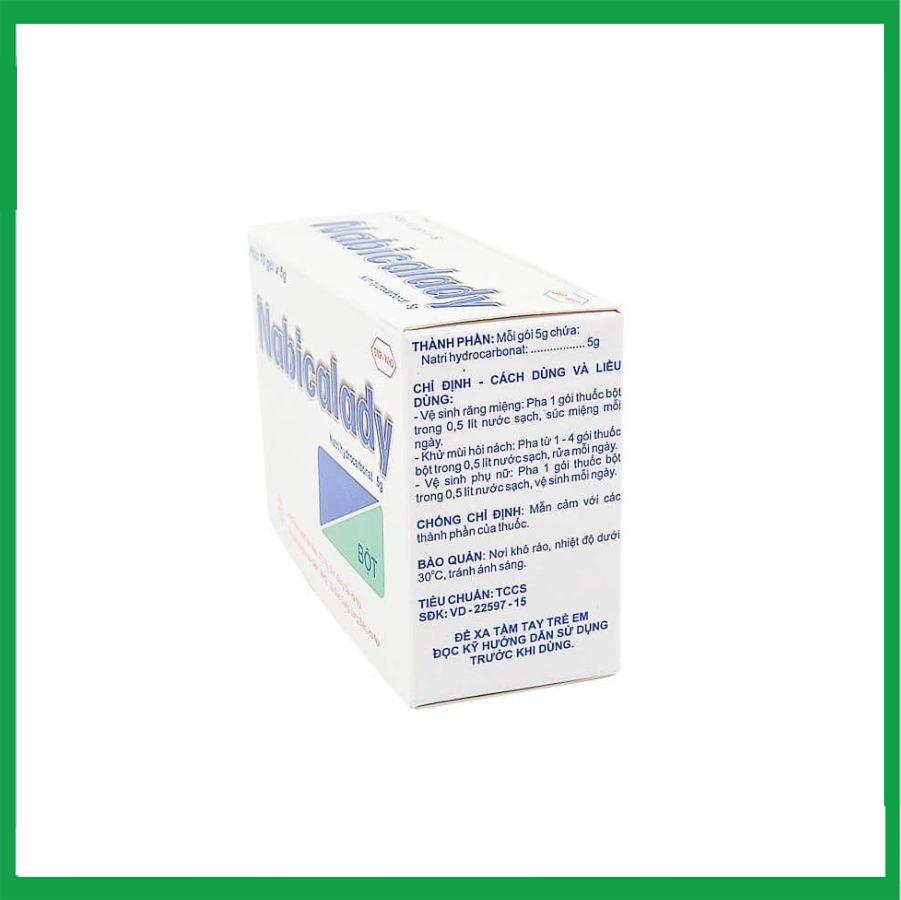 Thuốc bột Nabicalady hộp 10 gói x 5g/gói của Công ty Cổ phần hóa dược Việt Nam có thành phần Natri Bicarbonat được chỉ định để vệ sinh răng miệng, khử mùi, vệ sinh phụ nữ