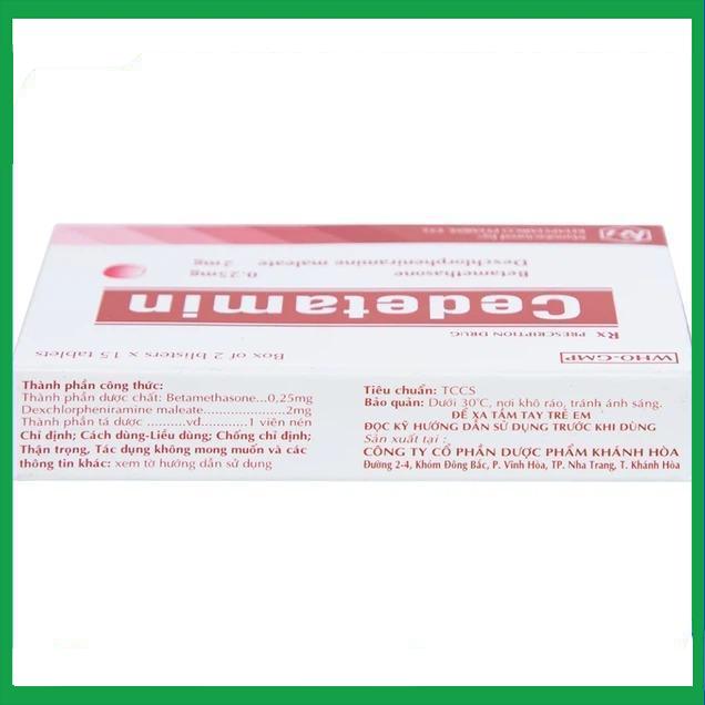 Cedetamin 2mg của Công ty cổ phần dược phẩm Khánh Hòa, thành phần chính Betamethason, Cedetamin điều trị viêm mũi dị ứng, nổi mề đay, hen phế quản mãn, viêm lách do dị ứng, phản ứng phản vệ với thuốc, viêm da dị ứng, chàm, viêm da do tiếp xúc, viêm kết mạc dị ứng.