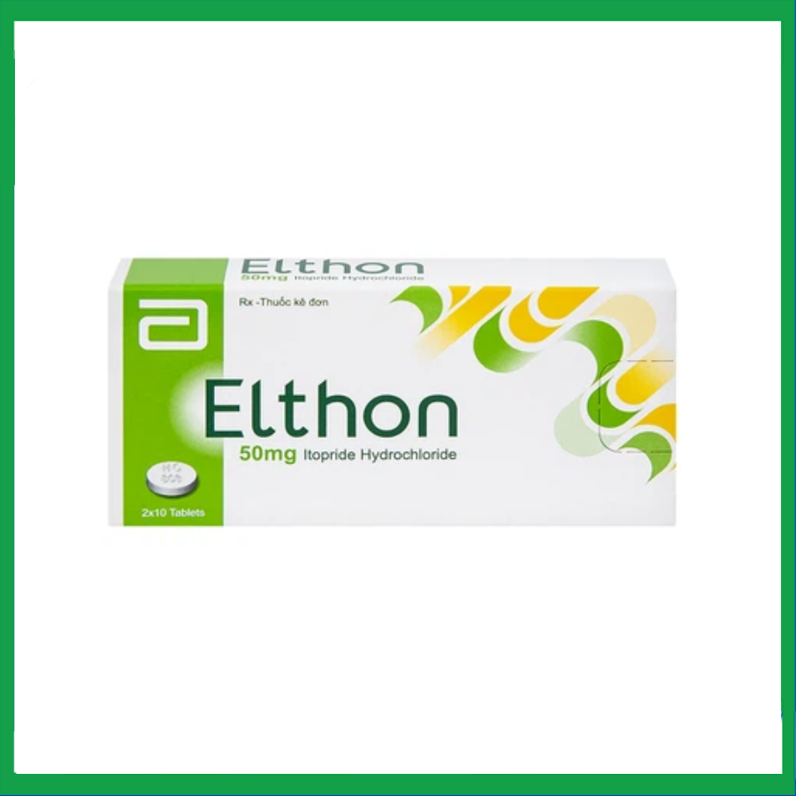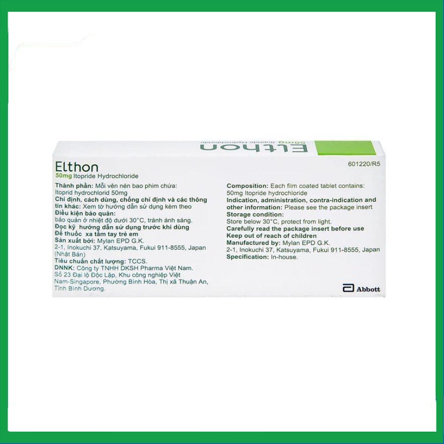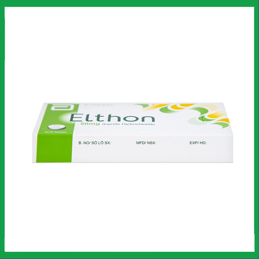 Thuốc Elthon 50mg của Công ty Abbott Japan Co., Ltd – Nhật Bản, thành phần chính Itoprid Hydrochlorid 50mg là loại thuốc được dùng để điều trị các triệu chứng dạ dày ruột gây ra bởi khó tiêu chức năng, khó tiêu không do loét (viêm dạ dày mãn tính): Đầy bụng, chướng bụng, đau/khó chịu vùng bụng trên, ăn mau no, chán ăn, ợ nóng, buồn nôn, nôn.