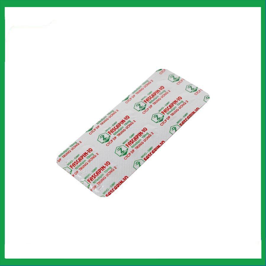 Thuốc Fascapin 10 là sản phẩm của Công ty Cổ phần Dược phẩm Trung ương 2, có thành phần chính là Nifedipine. Đây là sản phẩm dùng để dự phòng đau thắt ngực, cao huyết áp, hội chứng Raynaud.