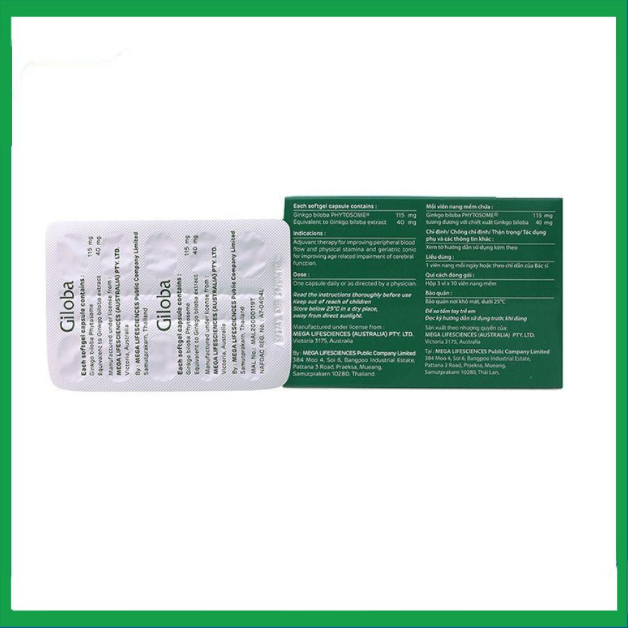 Giloba 40mg của Mega Lifesciences Public Company Limited, Thái Lan, là thuốc dùng để điều trị suy tuần hoàn não và các biểu hiện chức năng: Chóng mặt, nhức đầu, giảm trí nhớ, giảm khả năng nhận thức, rối loạn vận động, rối loạn cảm xúc và nhân cách. Di chứng tai biến mạch máu não và chấn thương sọ não.