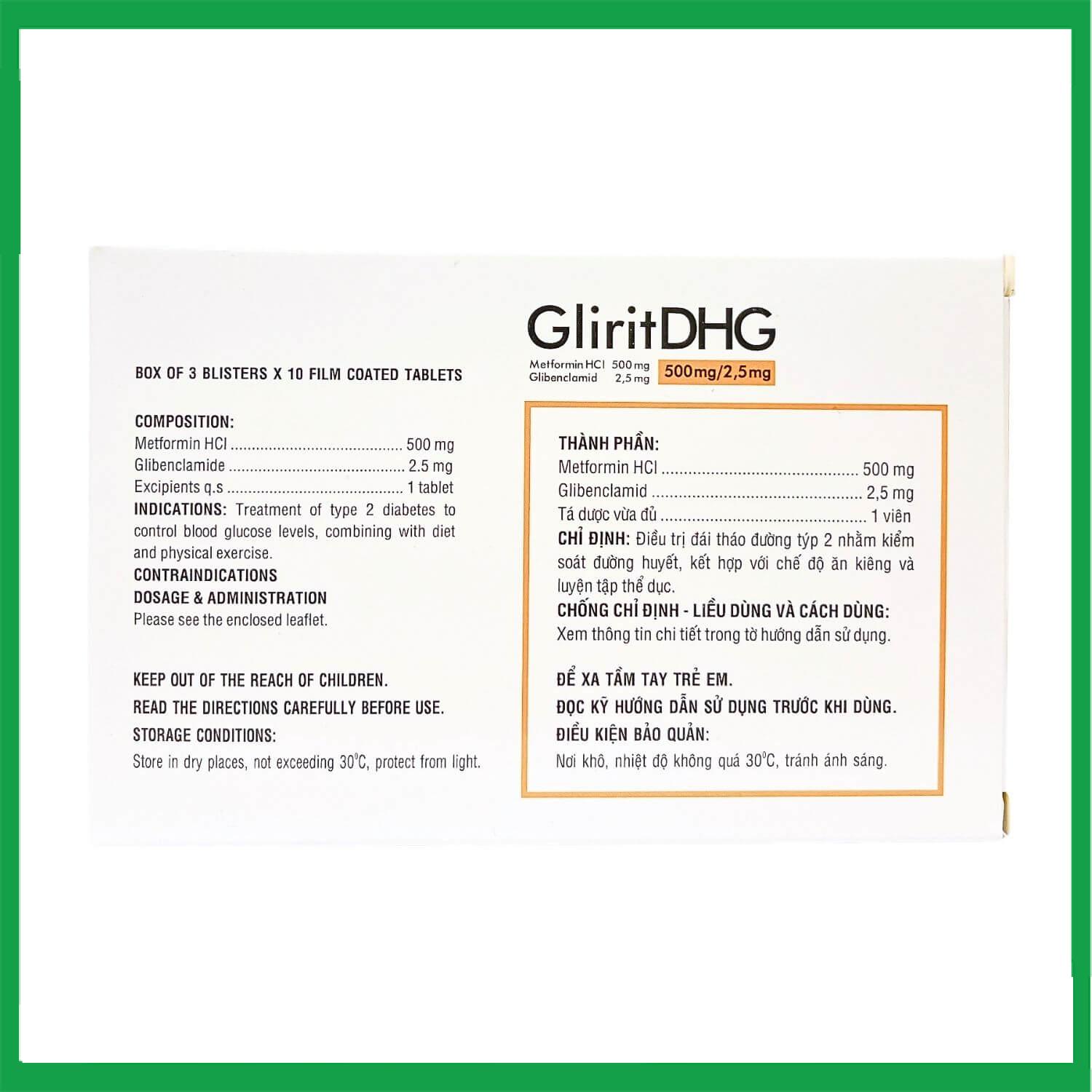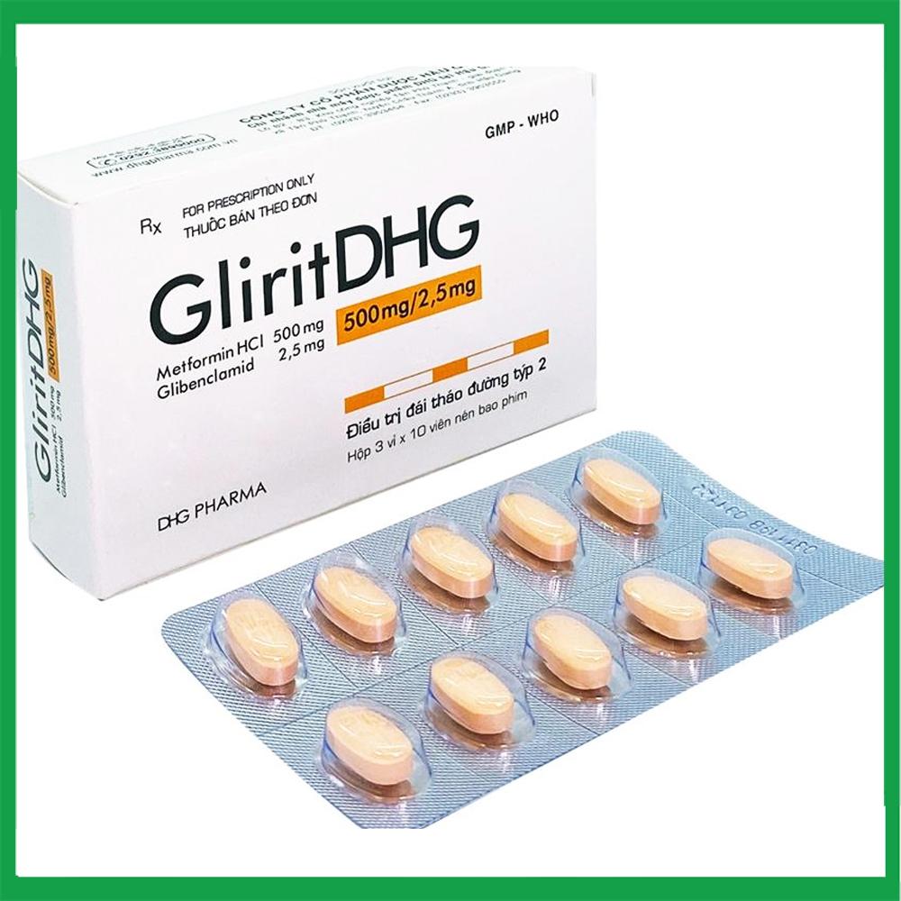 GliritDHG là thuốc điều trị đái tháo đường týp 2, với thành phần hoạt chất chính là metformin kết hợp với glibenclamid. Metformin thuộc nhóm biguanid, có cơ chế tác dụng ngoại biên là làm tăng sử dụng glucose ở tế bào, cải thiện liên kết của insulin với thụ thể, ức chế tổng hợp glucose ở gan và giảm hấp thu glucose ở ruột.