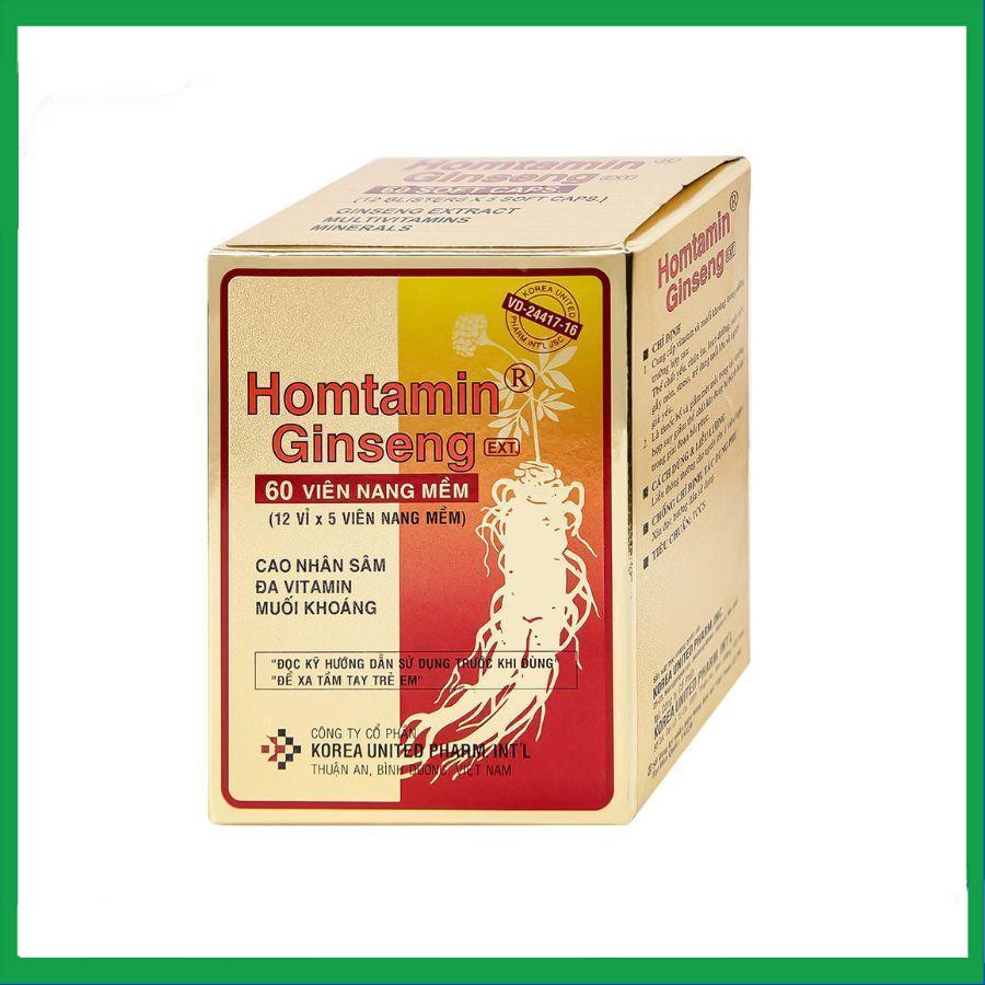 Thuốc Homtamin Ginseng là sản phẩm của Korea United Pharm có chứa cao nhân sâm; cao lô hội và các hoạt chất khác giúp cung cấp vitamin và muối khoáng trong những trường hợp sau: Thể chất yếu, chán ăn, loạn đường, mệt mỏi, gây mòn, stress, trẻ đang tuổi lớn và người già yếu. Là thuốc bổ và giảm mệt mỏi trong các trường hợp suy giảm thể chất khi đang bị bệnh hoặc trong giai đoạn hồi phục.