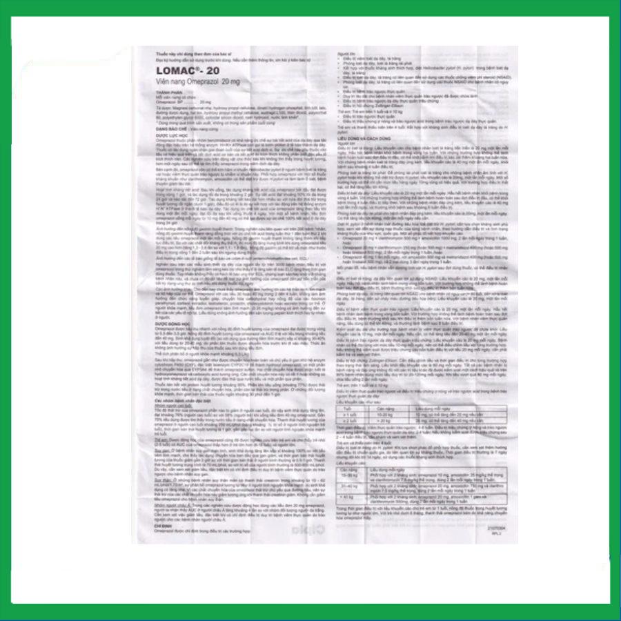 Lomac – 20mg của nhà sản xuất Cipla Ltd, thành phần chính omeprazol. Đây là thuốc dùng để điều trị các trường hợp: Viêm loét dạ dày, tá tràng, phòng loét dạ dày, loét tá tràng tái phát. Kết hợp với thuốc kháng sinh thích hợp, diệt Helicobacter pylori (H. pylori) trong bệnh loét dạ dày, tá tràng. Điều trị loét dạ dày, tá tràng có liên quan đến sử dụng các thuốc chống viêm phi steroid (NSAID)… Điều trị bệnh trào ngược thực quản. Duy trì lâu dài cho bệnh nhân viêm thực quản trào ngược đã được chữa lành…