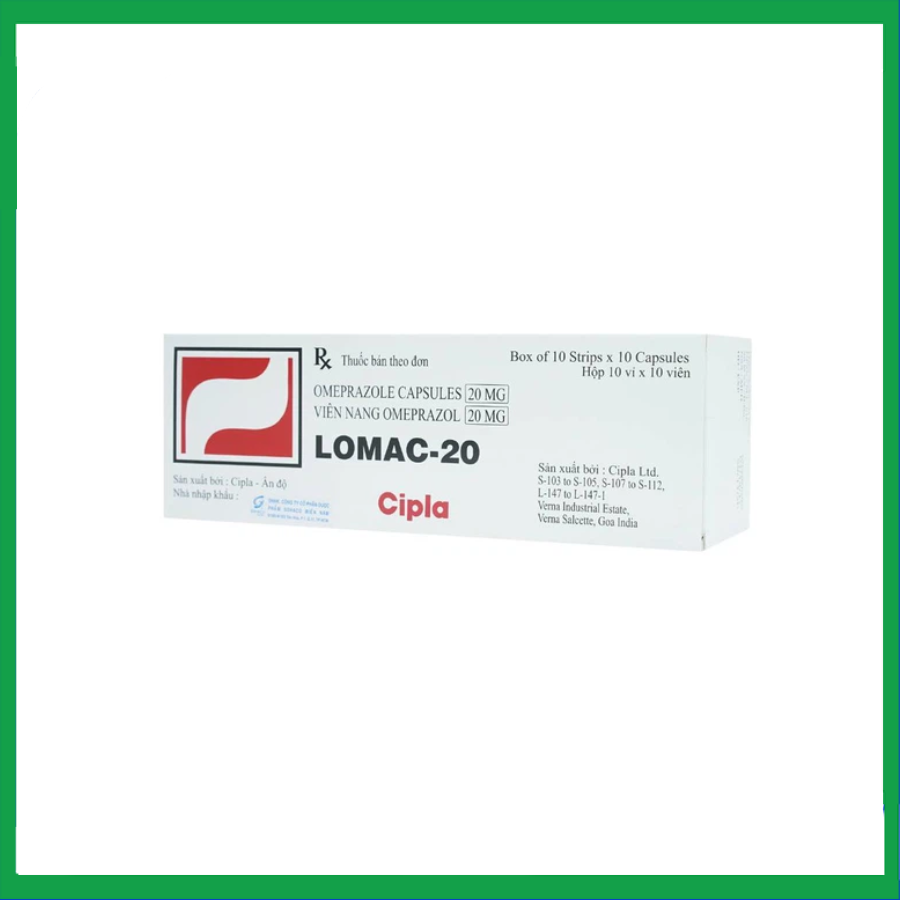 Lomac - 20mg của nhà sản xuất Cipla Ltd, thành phần chính omeprazol. Đây là thuốc dùng để điều trị các trường hợp: Viêm loét dạ dày, tá tràng, phòng loét dạ dày, loét tá tràng tái phát. Kết hợp với thuốc kháng sinh thích hợp, diệt Helicobacter pylori (H. pylori) trong bệnh loét dạ dày, tá tràng. Điều trị loét dạ dày, tá tràng có liên quan đến sử dụng các thuốc chống viêm phi steroid (NSAID)... Điều trị bệnh trào ngược thực quản. Duy trì lâu dài cho bệnh nhân viêm thực quản trào ngược đã được chữa lành...