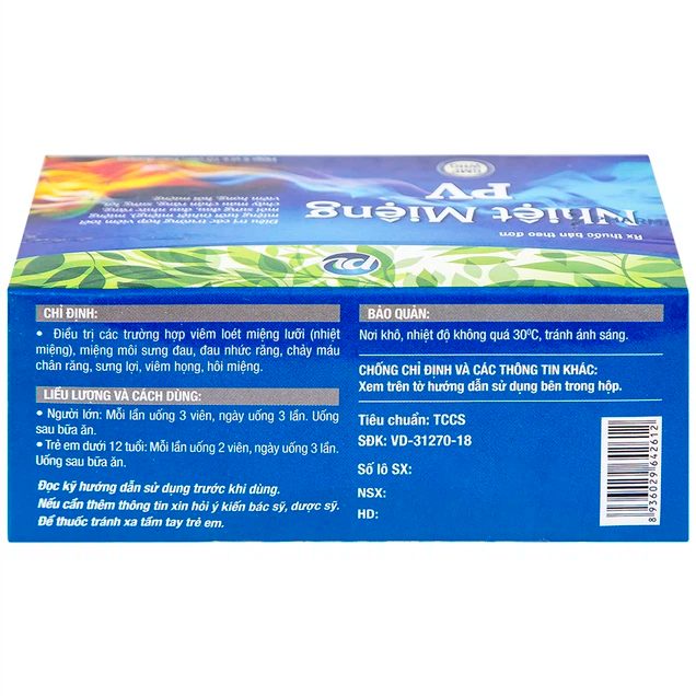 Nhiệt Miệng PV 5X10 có tác dụng thanh nhiệt, giải độc, chống viêm, tiêu sưng.Dược động học