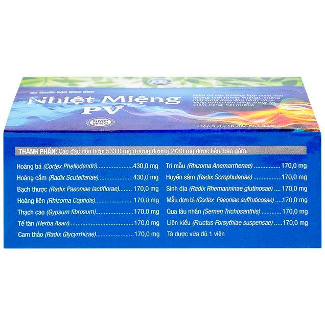 Nhiệt Miệng PV 5X10 của Công ty cổ phần Dược Phúc Vinh có thành phần chính gồm hoàng bá, hoàng cầm, bạch thược, hoàng liên, thạch cao, tế tân, cam thảo, tri mẫu, huyền sâm, sinh địa, mẫu đơn bì, qua lâu nhân, liên kiều.