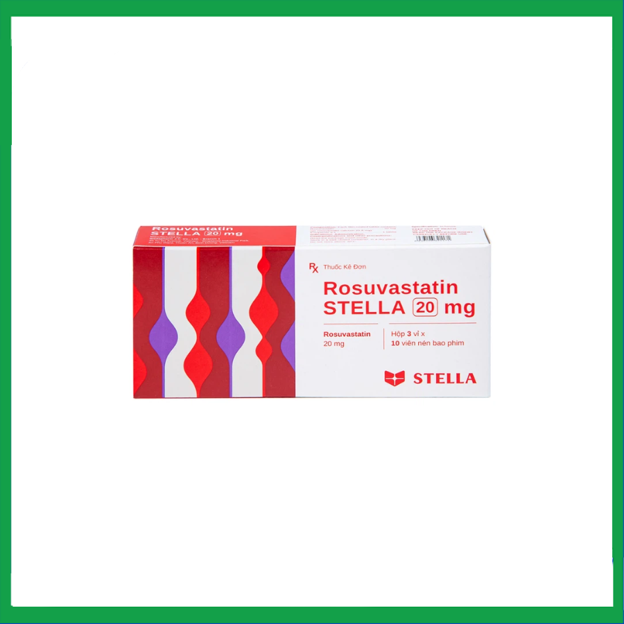 Rosuvastatin 20 mg của Công ty TNHH LD Stellapharm là viên nén hình tròn, bao phim màu đỏ nhạt, hai mặt trơn, thành phần chính là rosuvastatin, là thuốc điều trị rối loạn lipid máu, phòng ngừa biến cố tim mạch.