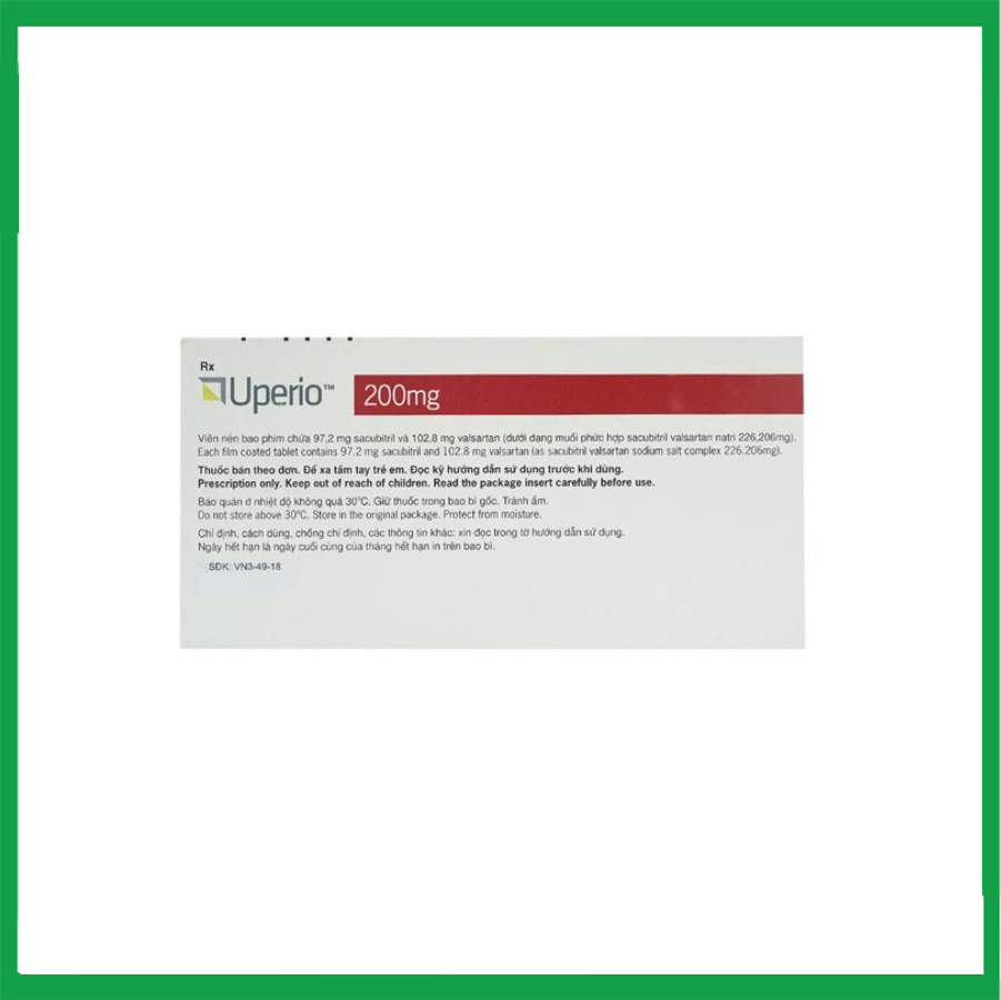 Thuốc Uperio 200 mg là sản phẩm của Công ty Novartis Singapore Pharmaceutical Manufacturing Pte. Ltd., thành phần chính bao gồm sacubitril và valsartan. Thuốc dùng để điều trị suy tim có triệu chứng ở bệnh nhân có rối loạn chức năng tâm thu.