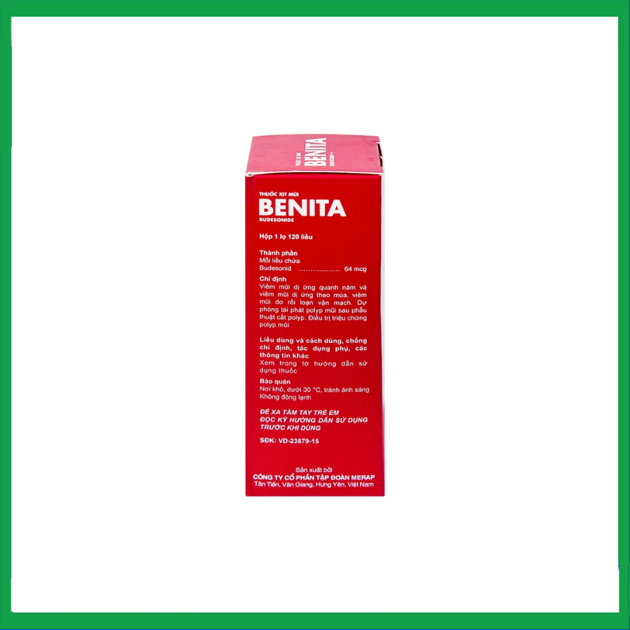 Thuốc Benita là sản phẩm của Công Ty Cổ Phần Tập Đoàn Merap, chứa dược chất chính là budesonid – một loại thuốc corticosteroid, được dùng để điều trị viêm mũi dị ứng quanh năm và viêm mũi dị ứng theo mùa, viêm mũi do rối loạn vận mạch, dự phòng tái phát polyp mũi sau phẫu thuật cắt polyp, điều trị triệu chứng polyp mũi.