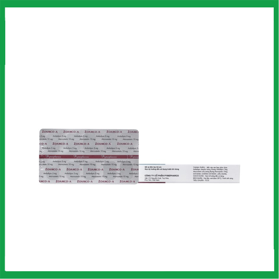 Thuốc Zoamco – A là sản phẩm của công ty Cổ phần Pymepharco, có thành phần chính là amlodipine besylat tương đương với amlodipin 5 mg và atorvastatin calci tương đương với atorvastatin 10 mg. Thuốc được chỉ định cho những bệnh nhân được điều trị đồng thời với cả 2 thuốc amlodipin và atorvastatin.