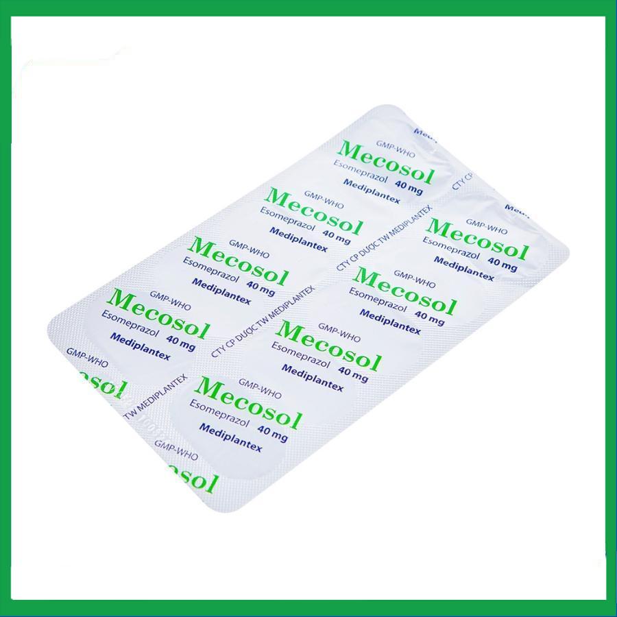 Thuốc Mecosol là sản phẩm của Công ty Cổ phần Dược TW Mediplantex, với thành phần chính esomeprazol (dạng vi hạt bao tan trong ruột chứa esomeprazol magnesium dihydrat) 40mg. Đây là thuốc được sử dụng trong điều trị bệnh trào ngược dạ dày thực quản (GERD) và được sử dụng kết hợp với amoxicillin và clarithromycin (Biaxin) để điều trị tình trạng loét dạ dày và nhiễm H. pylori. Nó cũng được sử dụng để điều trị hội chứng Zollinger - Ellison. Esomeprazole kê đơn được sử dụng để điều trị chứng ợ nóng thường xuyên.