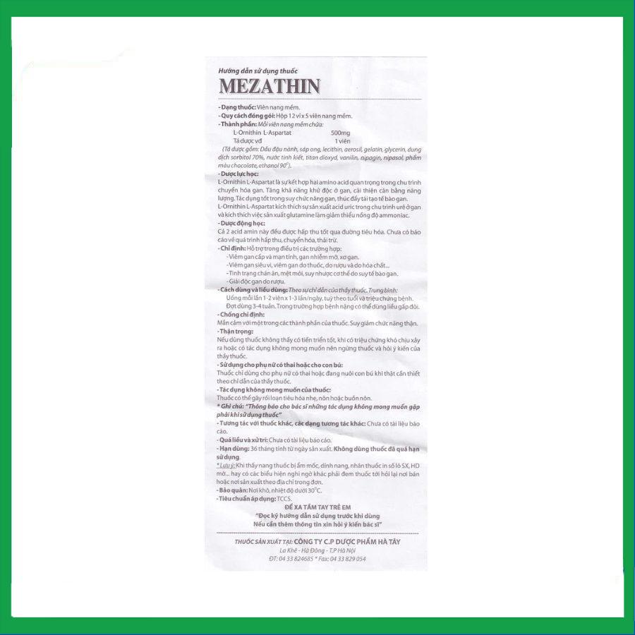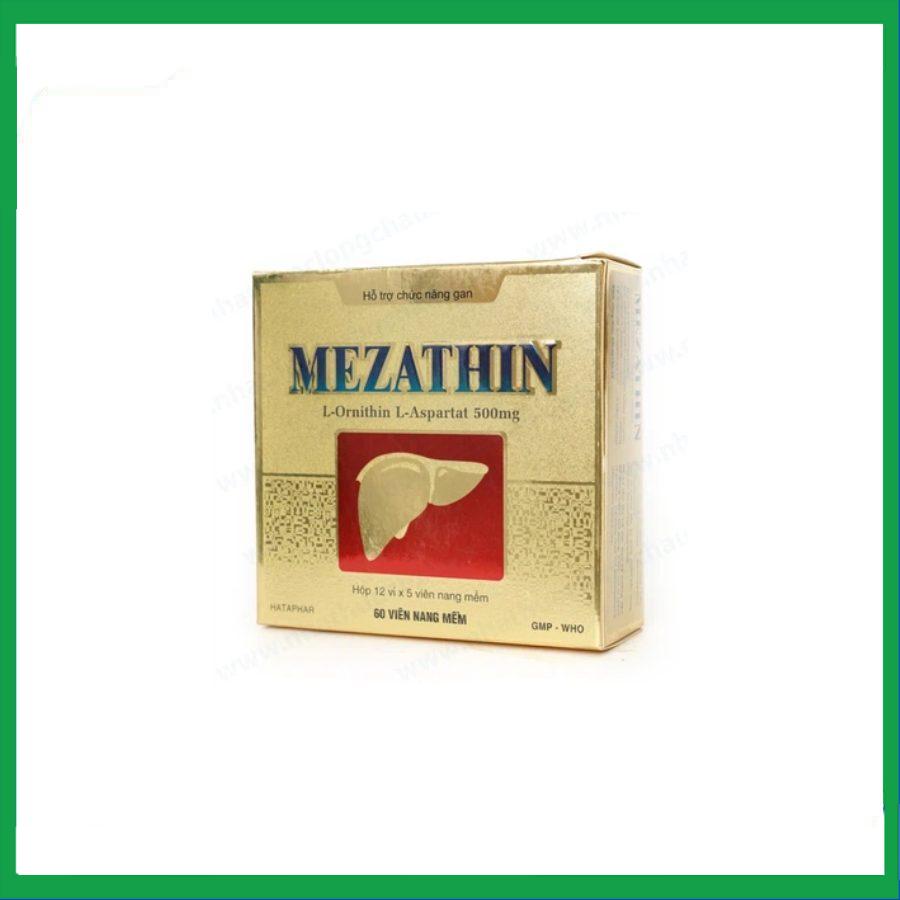 Thuốc Mezathin là sản phẩm của Dược phẩm Hà Tây, có thành phần chính L - Ornithin L - Aspartat với hàm lượng 500 mg. Thuốc dùng để hỗ trợ điều trị các bệnh về gan như: Viêm gan cấp và mạn tính, gan nhiễm mỡ, xơ gan, viêm gan siêu vi, viêm gan do thuốc, do rượu và do hóa chất...; cải thiện tình trạng chán ăn, mệt mỏi, suy nhược cơ thể do suy tế bào gan; giải độc gan do rượu.