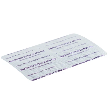 Metformin 850mg Stella của Stella Pharm, thành phần chính metformin hydroclorid, Metformin 850mg Stella điều trị bệnh tiểu đường không phụ thuộc insulin (typ II): Ðơn trị liệu, khi không thể điều trị tăng glucose huyết bằng chế độ ăn đơn thuần.