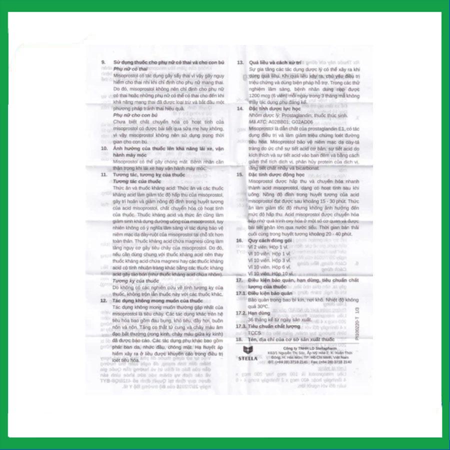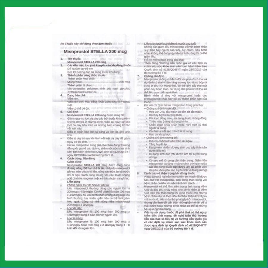 Thuốc Misoprotosol Stella 200mcg sản phẩm của Công ty TNHH LD Stellapharm, với thành phần chính là Misoprostol. Thuốc Misoprotosol Stella 200mcg được sử dụng để giảm nguy cơ loét dạ dày và điều trị ngắn hạn loét tá tràng, loét dạ dày lành tính.