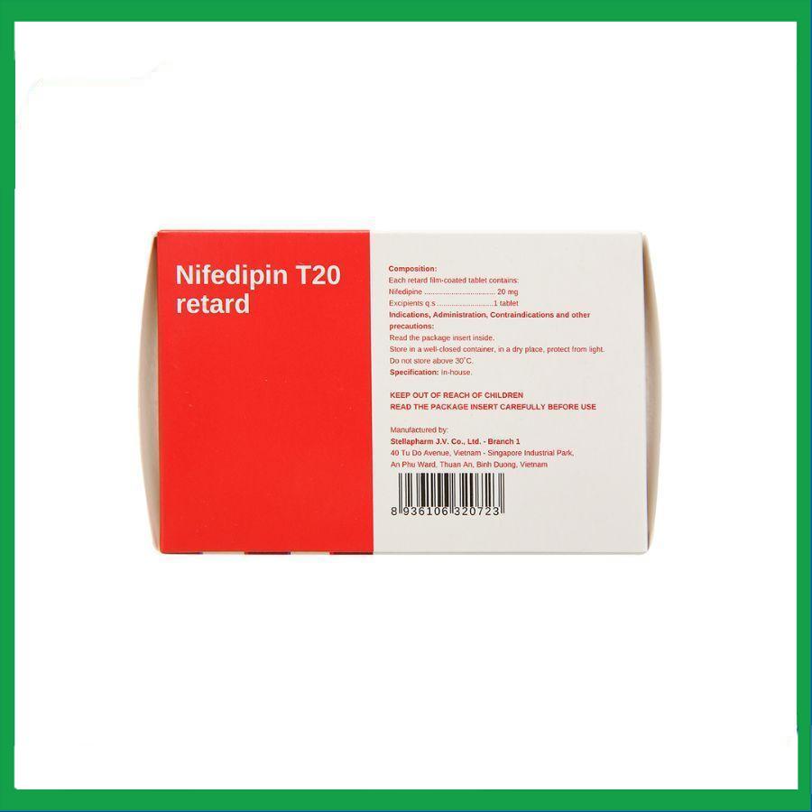 Thuốc Nifedipin T20 Retard là sản phẩm của Stellapharm, thành phần chính là nifedipine. Nifedipin T20 retard có tác dụng dự phòng đau thắt ngực, đặc biệt khi có yếu tố co mạch như trong đau thắt ngực kiểu Prinzmetal; điều trị tăng huyết áp.