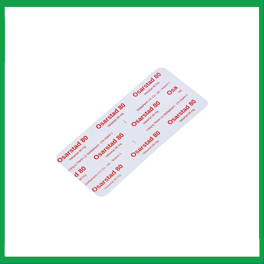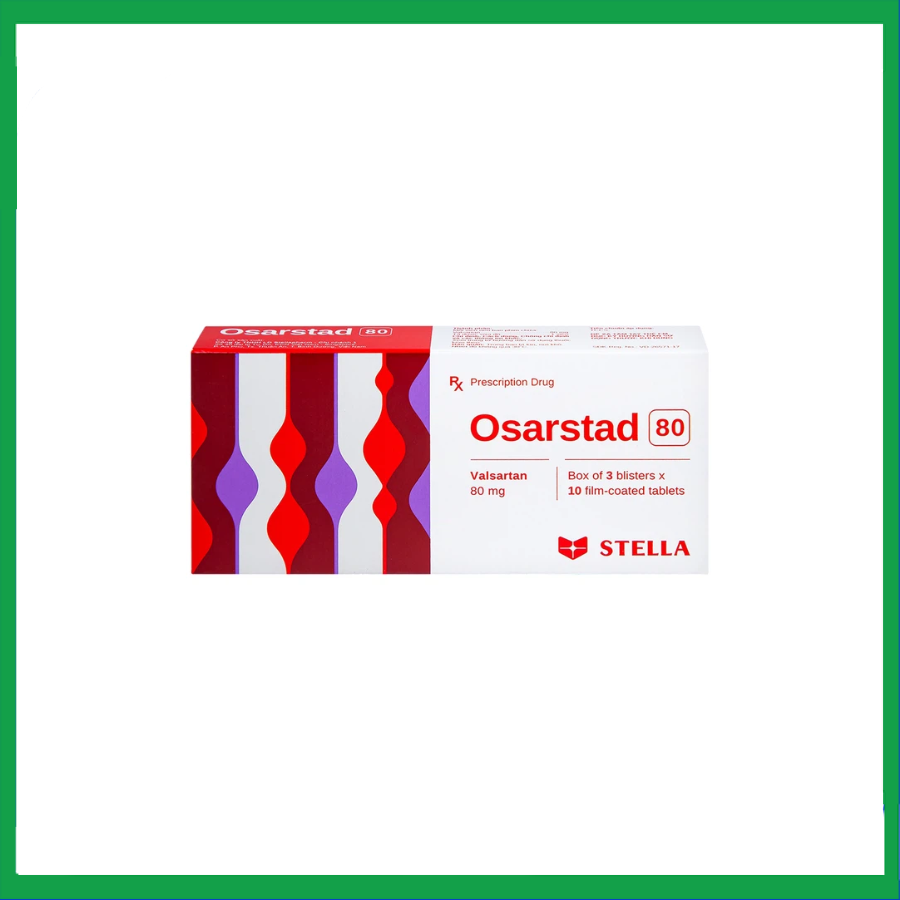 Osarstad 80 được sản xuất bởi công ty TNHH LD Stellapharm – chi nhánh 1, với thành phần chính Valsartan, là thuốc dùng để điều trị tăng huyết áp nguyên phát ở người lớn, tăng huyết áp ở trẻ em và vị thành niên 6 - 18 tuổi, điều trị sau nhồi máu cơ tim (12 giờ - 10 ngày) ở người lớn (đã ổn định về lâm sàng) suy tim có triệu chứng hoặc rối loạn chức năng tâm thu thất trái không có triệu chứng và điều trị suy tim có triệu chứng ở người lớn khi không thể dùng thuốc ức chế enzyme chuyển angiotensin (ACE) hay là liệu pháp thêm vào thuốc ức chế ACE khi không thể dùng thuốc chẹn beta.