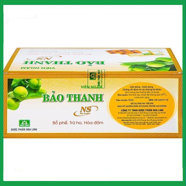 Viên ngậm Bảo Thanh không đường của Công ty TNHH Dược phẩm Hoa Linh, thành phần chính cao lỏng hỗn hợp xuyên bối mẫu, tỳ bà lá, sa sâm, phục linh, trần bì, cát cánh, bán hạ, ngũ vị tử, qua lâu nhân, viễn chí, khổ hạnh nhân, gừng, ô mai, cam thảo và tinh dầu bạc hà; thuốc dùng để điều trị các chứng ho do cảm lạnh, nhiễm lạnh, ho gió, ho khan, ho có đờm, ho do dị ứng thời tiết; người bị phế âm hư gây ho dai dẳng lâu ngày, miệng họng khô, cổ họng ngứa, nóng rát, khản tiếng; hỗ trợ điều trị viêm phổi, viêm họng, viêm phế quản.